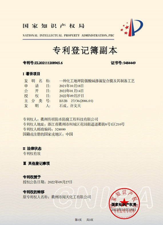 衢州傳祺新材料科技有限公司是衢州市聞天化工有限公司的下屬企業(yè);衢州市聞天化工有限公司成立于2003年,是國內最早研發(fā)、生產氟碳涂料的企業(yè)之一。衢州傳祺新材料科技有限公司成立于2017年,公司專注于高分子氟材料的開發(fā)和含氟材料在防腐、防水領域的應用。經(jīng)過6年的不懈努力,已獲得了化工和建筑領域六項國家發(fā)明專利授權和兩項新產品科技成果獎,參與了中國建筑材料流通協(xié)會《房屋修繕防水工程規(guī)范》標準的編制工作,中建協(xié)涂裝委員會浙西工作站設立在我公司。
